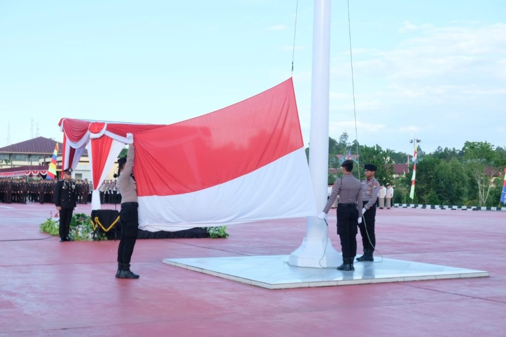 Pengibaran bendera Merah Putih dengan diiringi lagu kebangsaan Indonesia Raya pun berhasil ditunaikan dengan baik oleh personil Polda Kaltara, Sang Merah Putih tampak gagah berkibar di halaman Mako Polda Kaltara.