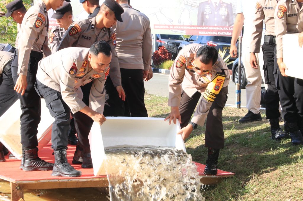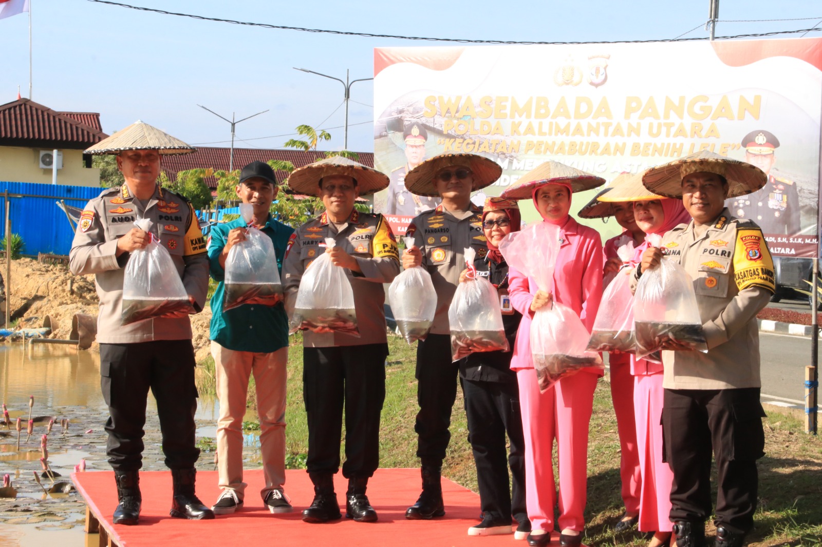 Polda Kaltara Melaksanakan Penebaran Benih Ikan Lele Dalam Rangka Mendukung Swasembada Pangan yang dilaksanakan di Kolam Ikan Asrama Polri Polda Kaltara Pada hari Jumat ( 15/11/2024).