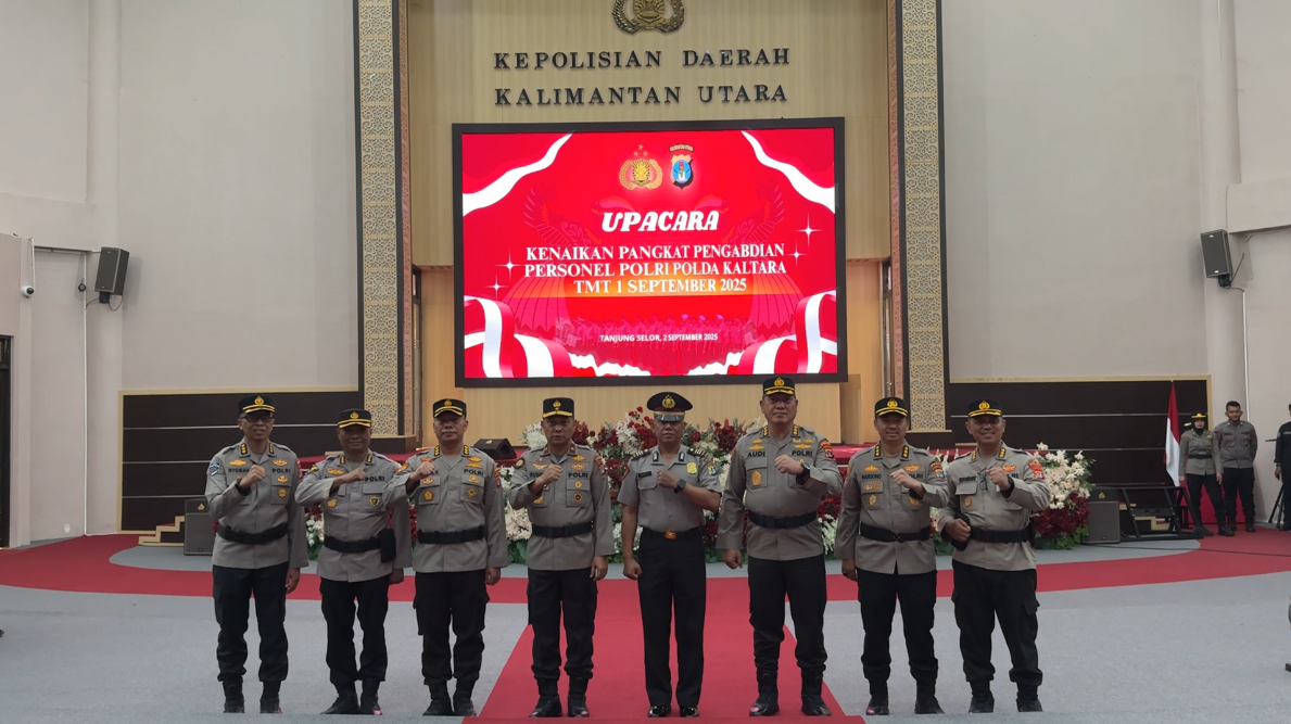 Tanjung Selor — Polda Kaltara melaksanakan Upacara Kenaikan Pangkat Pengabdian Personel Polda Kaltara TMT 01 September 2025 pada Selasa (01/09/2025). Kegiatan bertempat di Ruang Rupatama Kayan Mapolda Kaltara yang dihadiri oleh para Pejabat Utama, Perwira Menengah (Pamen), Perwira Pertama (Pama), serta personel Bintara Polri lainnya.