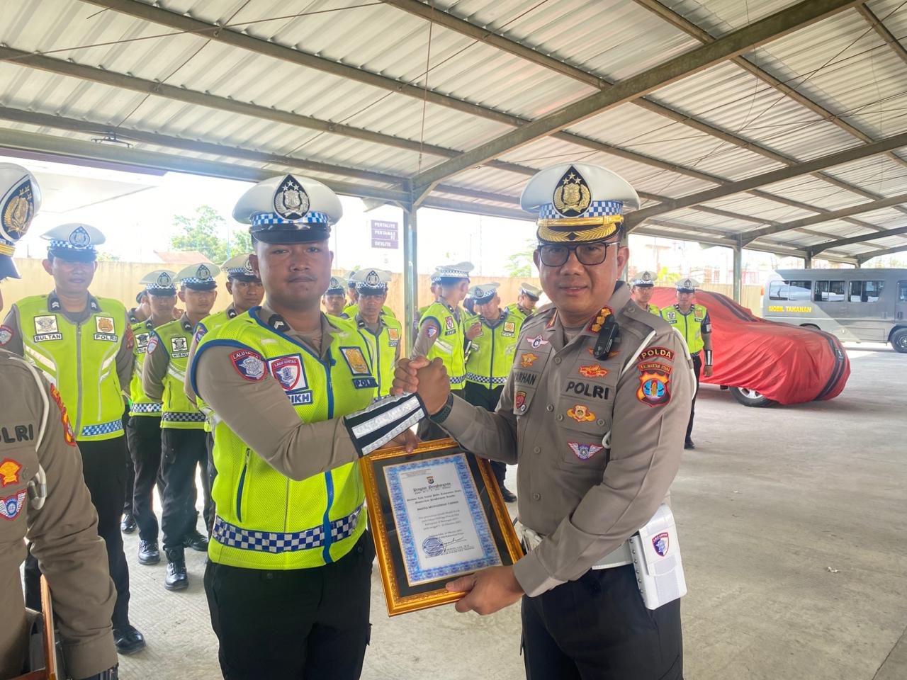 Dirlantas Polda Kaltara Kombes Pol. Muhamad Syarhan , S.I.K., M.H. memberikan penghargaan kepada sejumlah personel Lalu Lintas yang telah menunjukan prestasi, loyalitas, dan tanggung jawab tinggi dalam menjalankan tugas di bidang lalu lintas, yang bertempat di Mapolda Kaltara pada Rabu ( 15/11/2025).