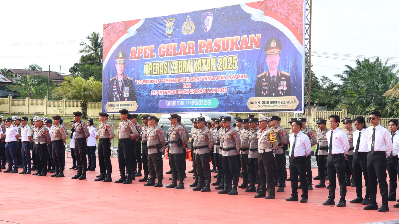 Polda Kaltara melaksanakan Apel Gelar Pasukan Operasi Zebra Kayan 2025 di Lapangan Mapolda Kaltara, Senin (17/11/2025). Kegiatan ini menjadi langkah awal dalam mewujudkan keamanan, keselamatan, ketertiban, dan kelancaran lalu lintas (Kamseltibcarlantas) menjelang Operasi Lilin 2025.