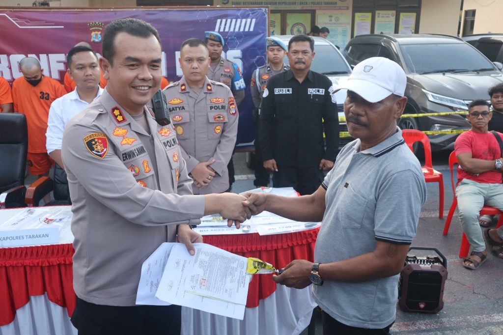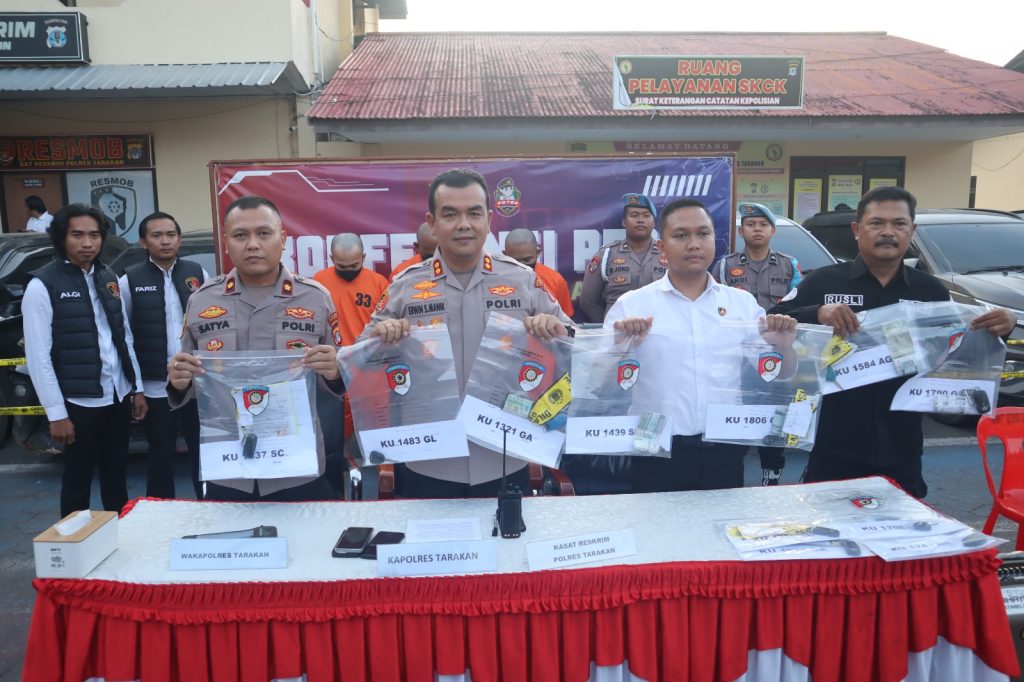 “Kami dari Polres Tarakan, Polda Kalimantan Utara, pada hari ini melaksanakan konferensi pers terkait hasil ungkap tindak pidana penggelapan dan atau penipuan. Modus yang digunakan adalah menyewa atau merental mobil untuk kemudian digadaikan,” jelasnya.