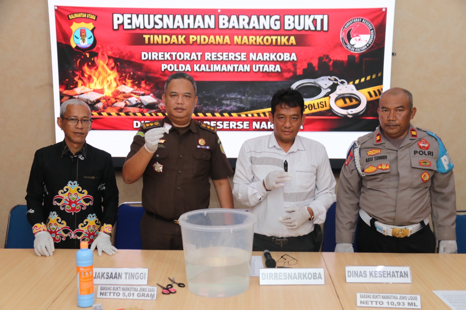 Total Barang Bukti Dimusnahkan diantaranya Liquid ganja sintetis: 10,93 gram/ml dan Sabu: 5,01 gram