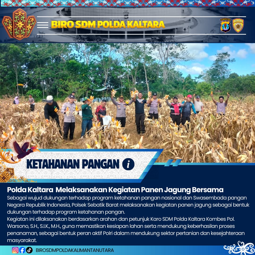 Panen jagung tersebut dilaksanakan berdasarkan arahan dan petunjuk Karo SDM Polda Kaltara, Kombes Pol. Warsono, S.H., S.I.K., M.H., yang menekankan pentingnya kesiapan lahan serta keberhasilan proses penanaman. Dengan adanya kegiatan ini, Polsek Sebatik Barat tidak hanya berperan menjaga keamanan, tetapi juga aktif mendukung program pemerintah untuk memperkuat ketahanan pangan nasional.