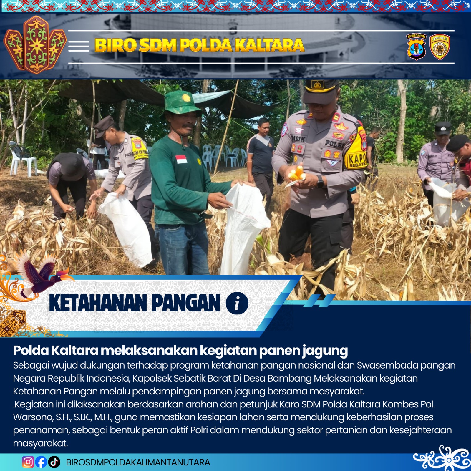 TRIBRATANews, Nunukan – Sebagai bentuk dukungan terhadap program ketahanan pangan nasional dan swasembada pangan Republik Indonesia, Kapolsek Sebatik Barat melaksanakan kegiatan pendampingan panen jagung bersama masyarakat di Desa Bambang. Senin (23/02/2026).