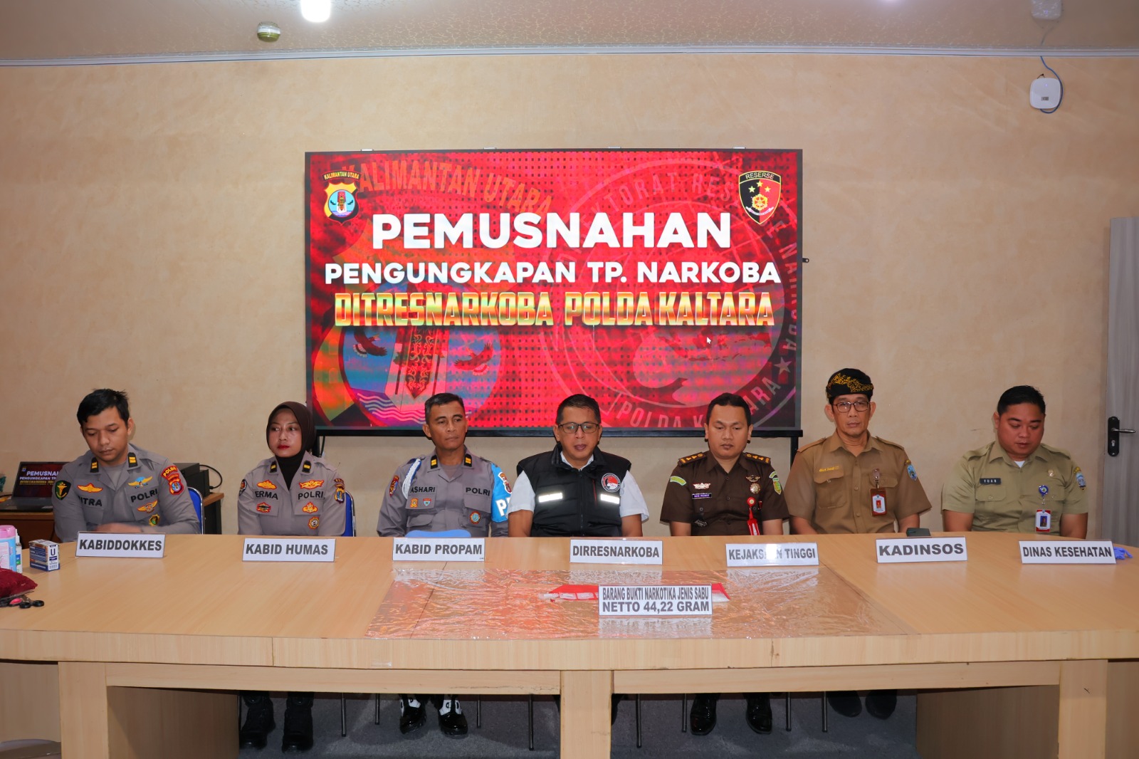 TRIBRATANews, Bulungan – Direktorat Reserse Narkoba (Ditresnarkoba) Polda Kalimantan Utara pada hari ini, Selasa (24/02/2026), melaksanakan pemusnahan barang bukti narkotika jenis sabu dengan total berat netto 44,22 gram di Ruang Ditresnarkoba Polda Kaltara.
