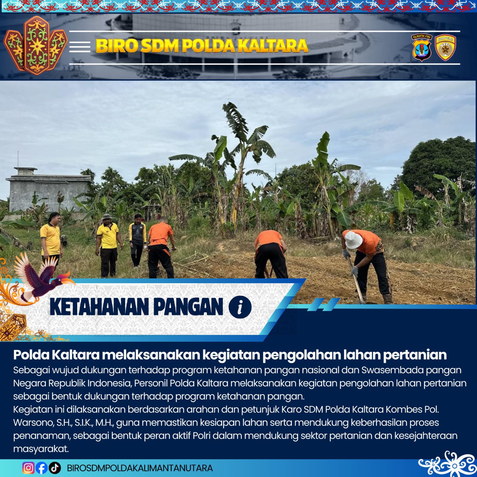 TRIBRATANews, Bulungan – Dalam rangka mendukung program ketahanan pangan nasional dan mewujudkan swasembada pangan di Negara Republik Indonesia, personil Polda Kalimantan Utara melaksanakan kegiatan pengolahan lahan pertanian. Kegiatan ini dilakukan sebagai bentuk kepedulian dan peran aktif Polri dalam mendukung sektor pertanian serta meningkatkan kesejahteraan masyarakat.